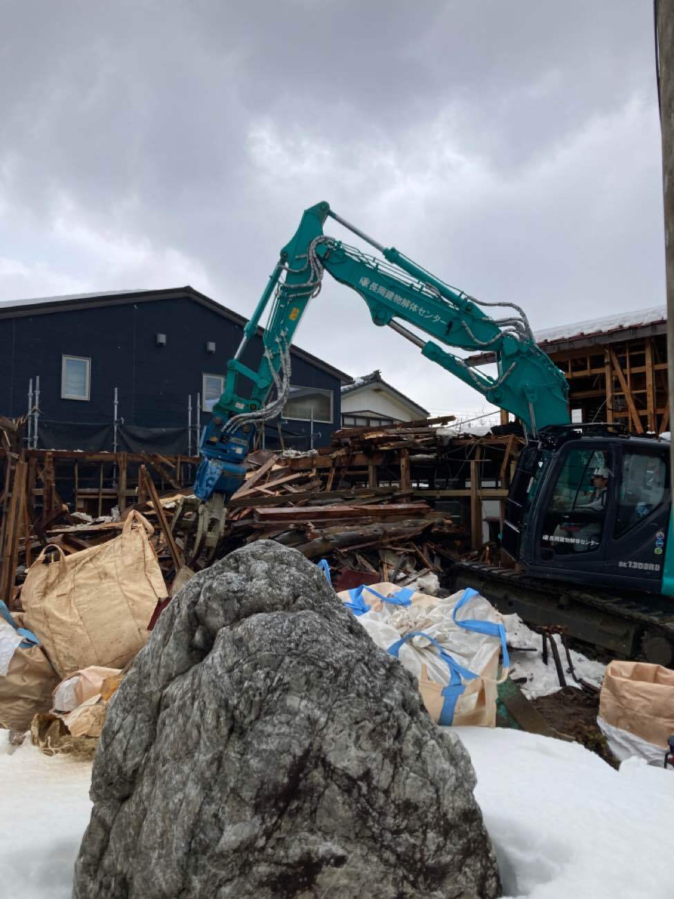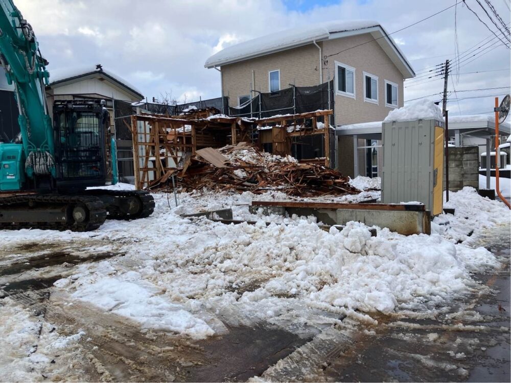 現地確認を行った上で、建物配置や作業動線を慎重に検討し、真冬の施工を前提とした工程計画を立てました。毎日の積雪により、解体作業と並行して除雪作業が必要となる厳しい条件でしたが、安全確保を最優先に、一日一日の状況を見極めながら工事を進めていきました。